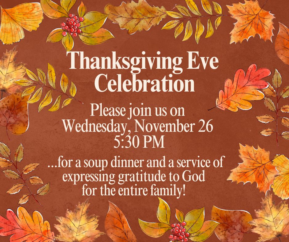 Join us for a soup/salad dinner and a service of expressing gratitude to God at our annual Thanksgiving Eve Celebration. This worship service is for the entire family. All ages are welcome and encouraged to participate. NO nursery available.